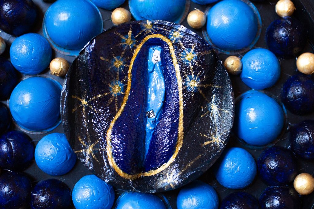 This project was to go beyond my comfort zone. Looking close up and intimately at one’s own genitalia in some cases seems taboo. I now think it should be part of a self-acceptance, self-loving practice that we can do with ourselves in private, and perhaps also share safely with others through sacred famine rituals that celebrate the holy vulva. Ninas project represented an opportunity to do this. It also gave a platform from which we could describe our relationship to this otherwise private part of our bodies, which is often ignored, defiled or insulted and yet is the source of life itself. Nina invited me to name my contribution to this project and CONSTELLATION is what came to mind. Our wombs are miracle life givers. Our bodies become more than biology.  They become vessels from which new souls can transcend beyond the fermament, through a portal and in a heartbeat create another human being.