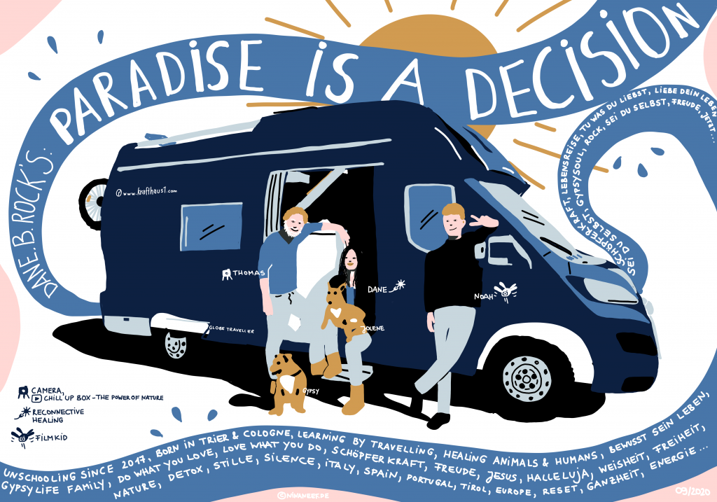 We were away. 10 months, 1 camper van, 8 selected stories and endless new inspirations for our lives. Maybe my illustrated summaries of these wonderful people will inspire you as much as they did us! – Wir waren dann mal weg. 10 Monate, 1 Wohnmobil, 8 ausgewählte Geschichten und unendlich viele neue Inspirationen für unser Leben. Vielleicht inspirieren dich meine illustrierten Zusammenfassungen dieser wunderbaren Menschen genau so wie uns!