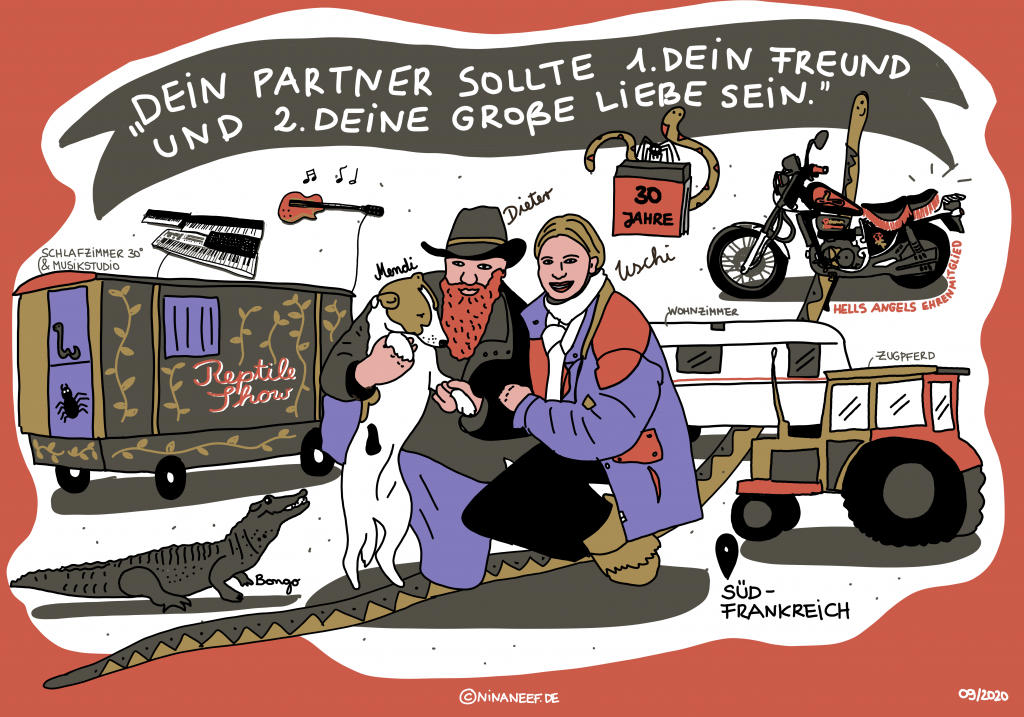Uschi and Dieter emigrated to the South of France 30 years ago. Now the two are reunited in the afterlife. They lived with their snakes and spiders in a circus wagon and a caravan. – Uschi und Dieter sind vor 30 Jahren nach Südfrankreich ausgewandert. Nun sind die beiden wieder im Jenseits vereint. Sie lebten mit ihren Schlangen und Spinnen in einem Zirkuswagen und einem Wohnwagen.